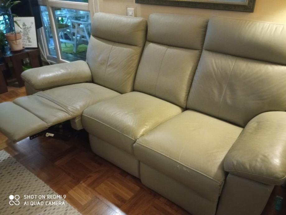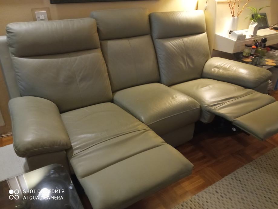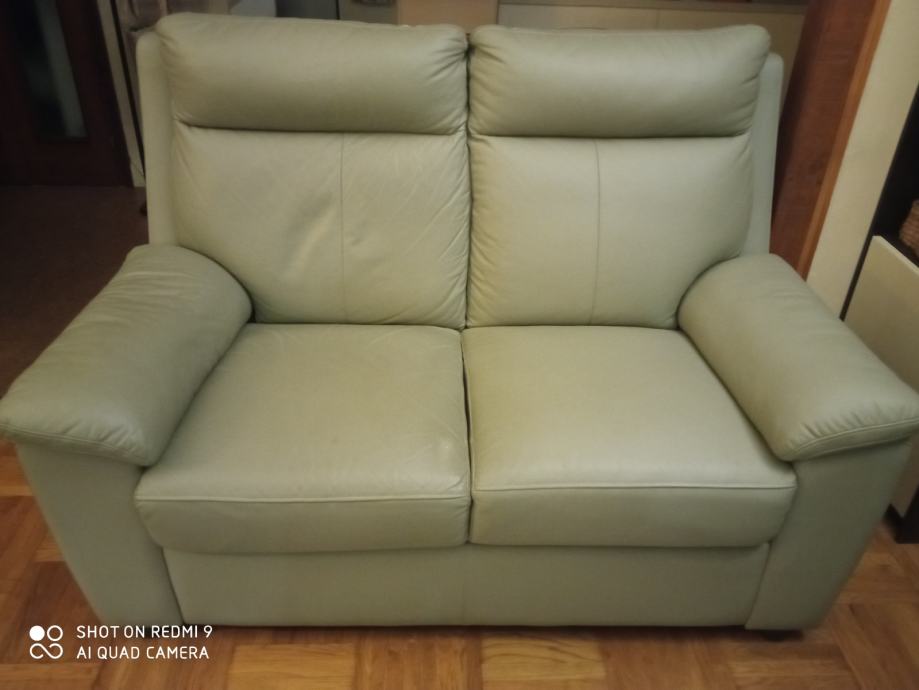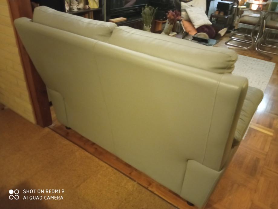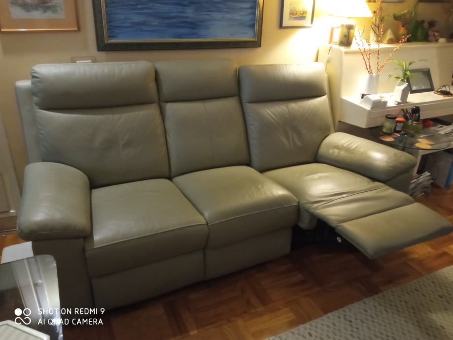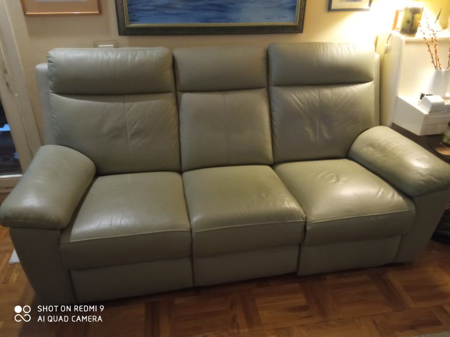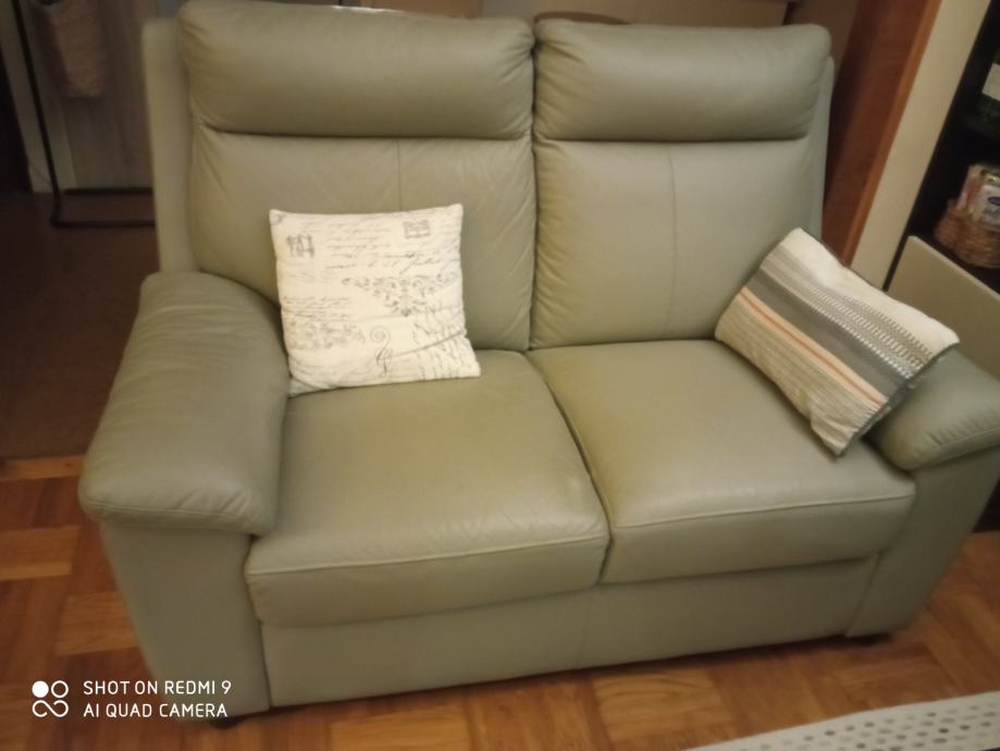Očuvan, malo korišten, 4 godine star, trosjed i dvosjed, kombinacija kože i eko kože (bočno i poleđina su eko). Na trosjedu relax mehanizam (mehanički) na krajnjim sjedalima, dvosjed bez relax mehanizma. Boja: sivo-maslinasta