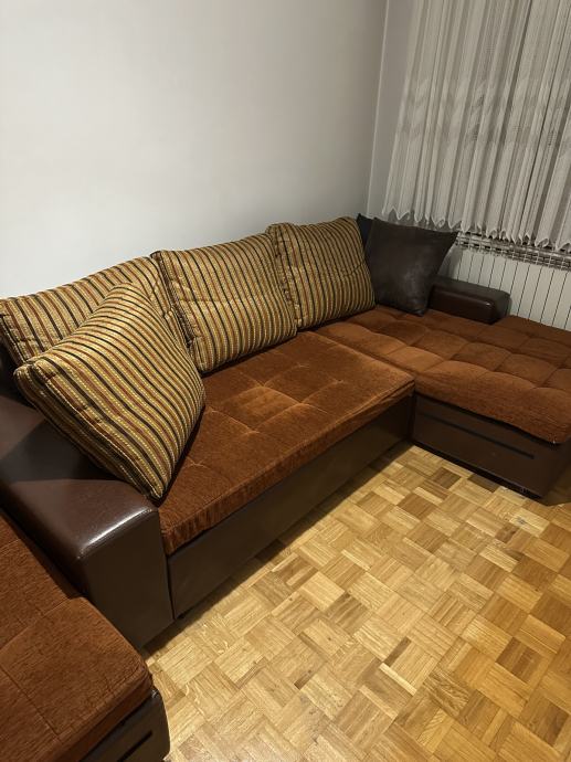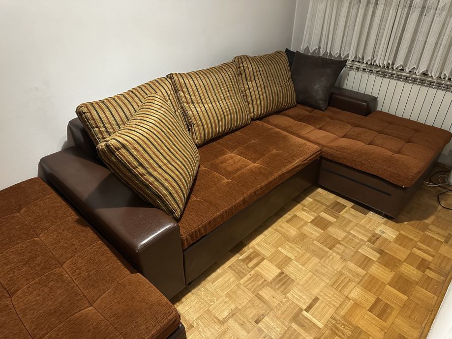 Kutnu garnituru za sjedenje, sa tabureom! Uz kauč idu i 4 jastuka.