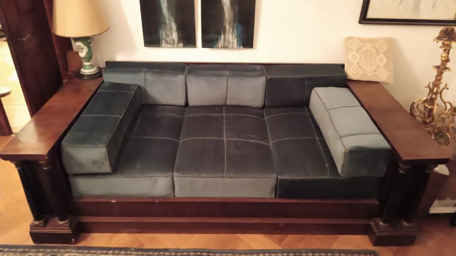 Veliki trosjed s čvrstom konstrukcijom od masivnog drva. Prostrani ormarići su s obje strane, svaki s jednom policom u sebi.