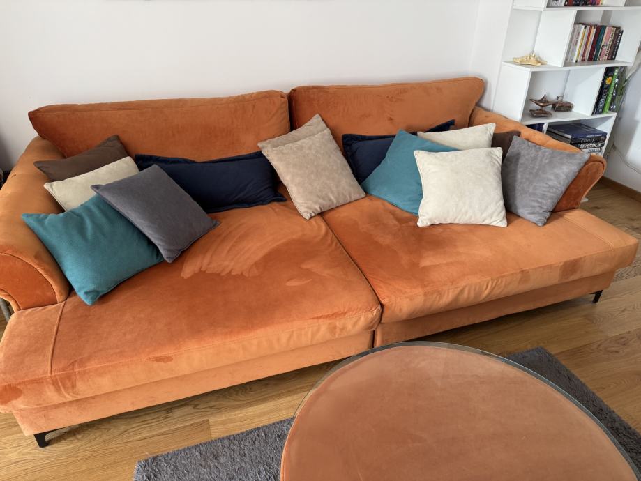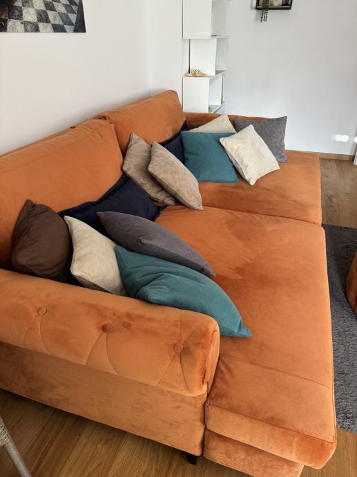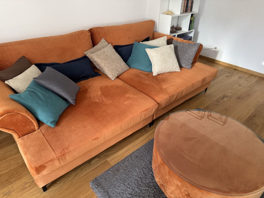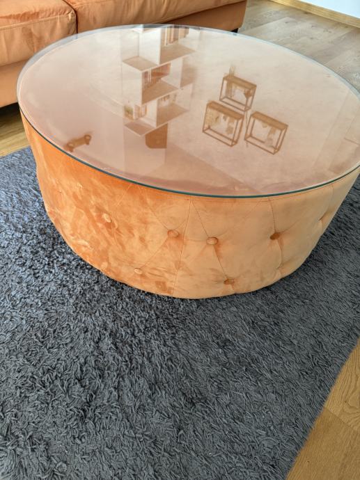 Velika sofa rađena po mjeri,vrhunske kvalitete(prava koža) u izvrsnom stanju i veliki tabure/stol uz koji ide staklo i noge za stol.