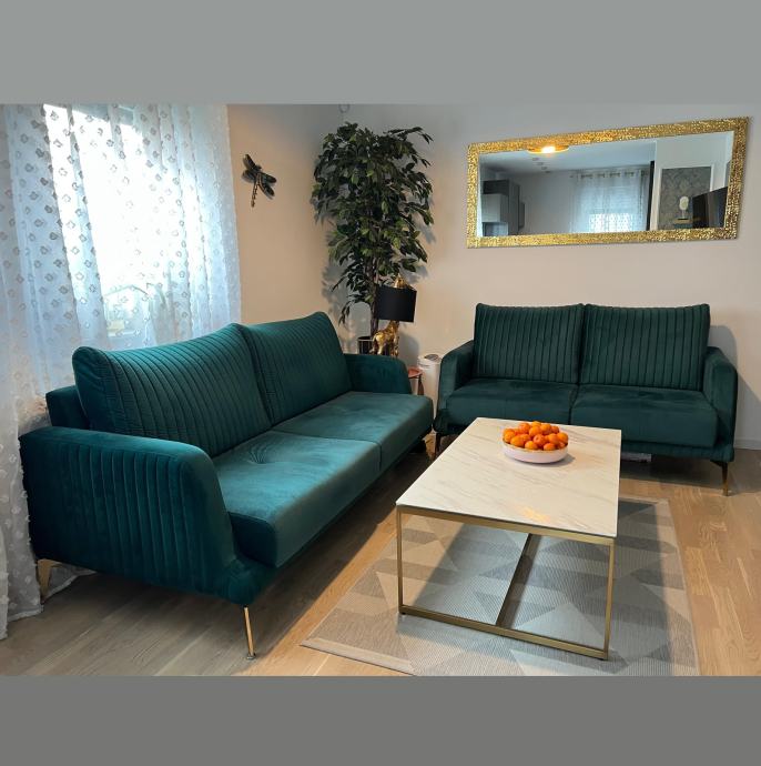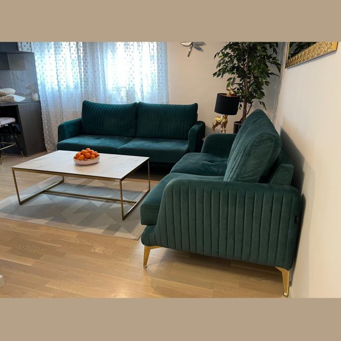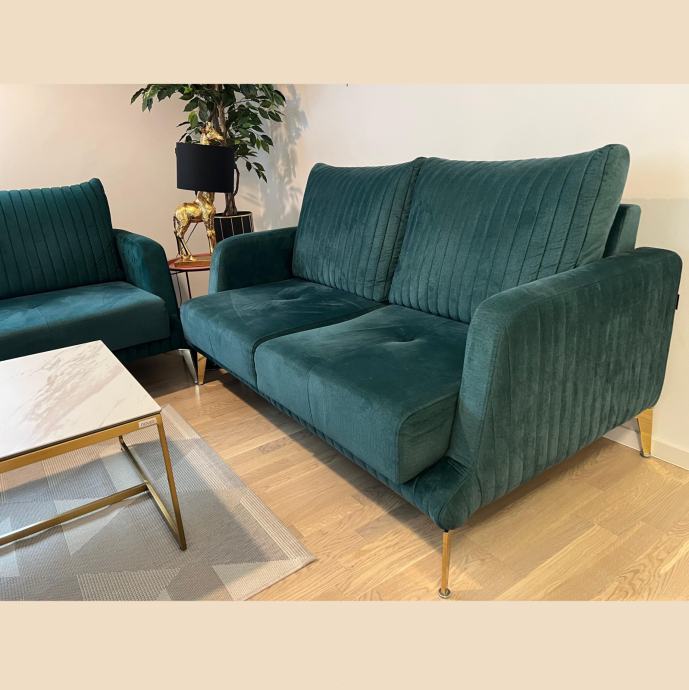 Prodaju se dvosjed i trosjed, odvojeno ili zajedno. Konstrukcija od punog drva, sjedišta od PU pjene, metalne zlatne noge i periva tkanina s odsjajem. Rotiranjem naslona na dvosjedu i trosjedu je moguće dobiti prostor za spavanje.