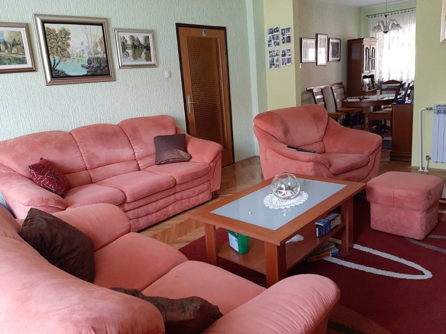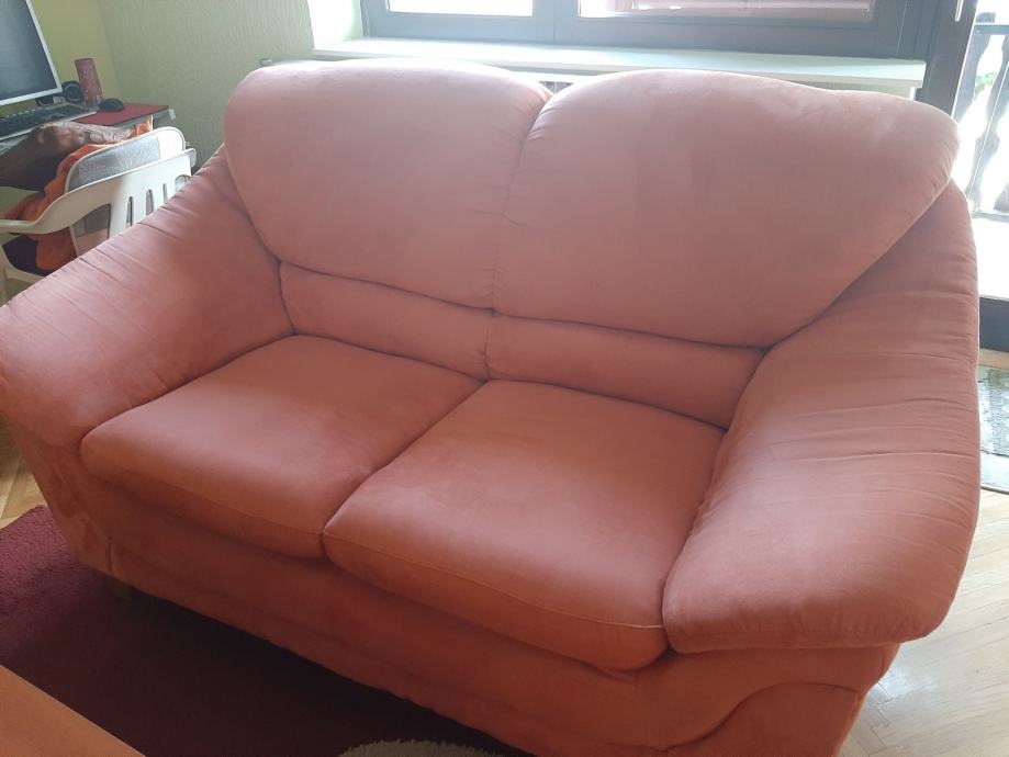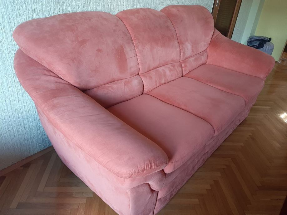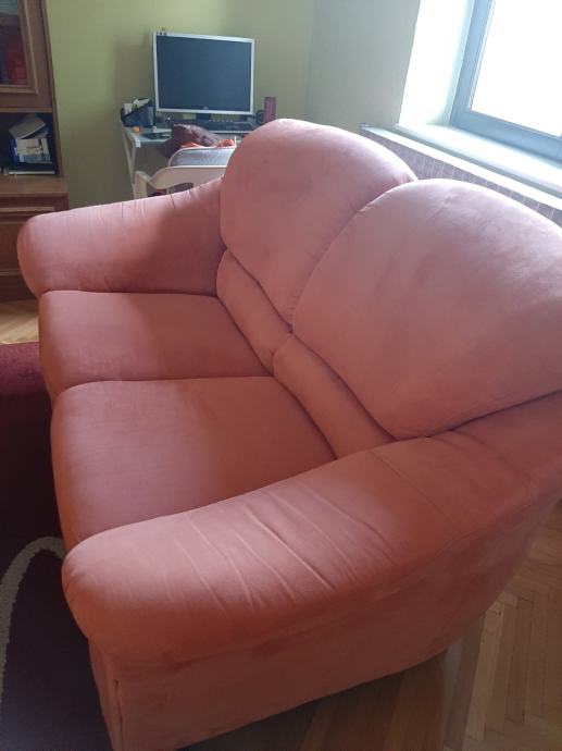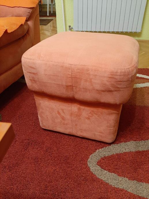 Komplet garnitura za dnevni boravak, može i posebno svaki dio. TROSJED 227x100, dvosjed 170x95, fotelja 117x100, tabure 48x48cm. Cijene : trosjed 800, dvosjed 600, fotelja 300, tabure 100 ili komplet sve 1500kn. Masivno, očuvano, materijal odličan za održavanje. Korišteno, ali maksimalno očuvano. Prodajem zbog selidbe.