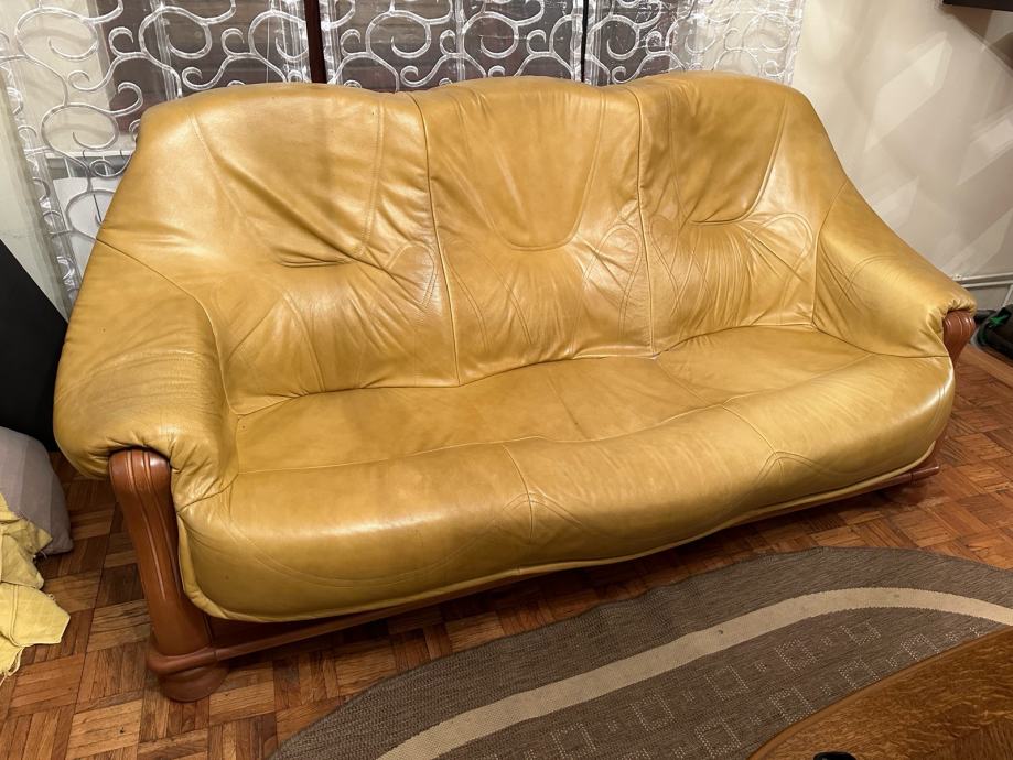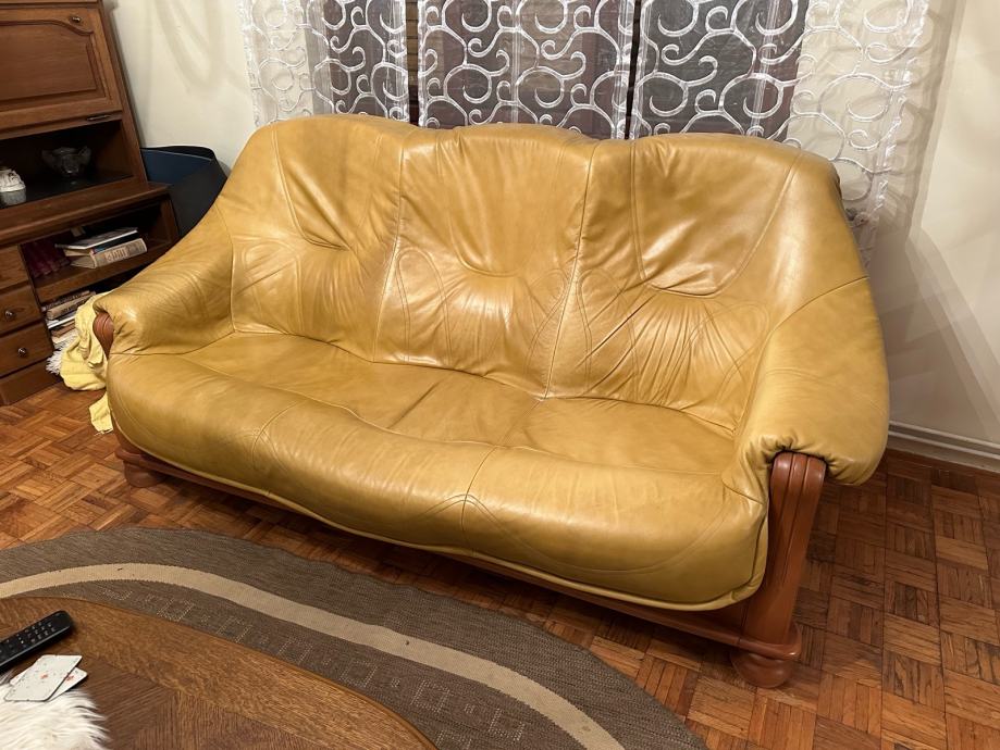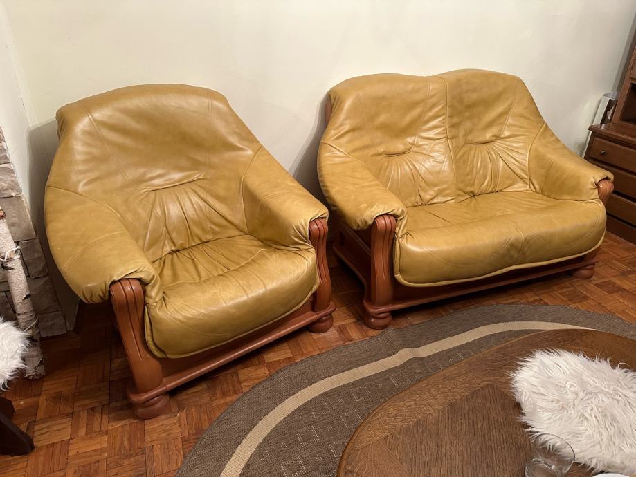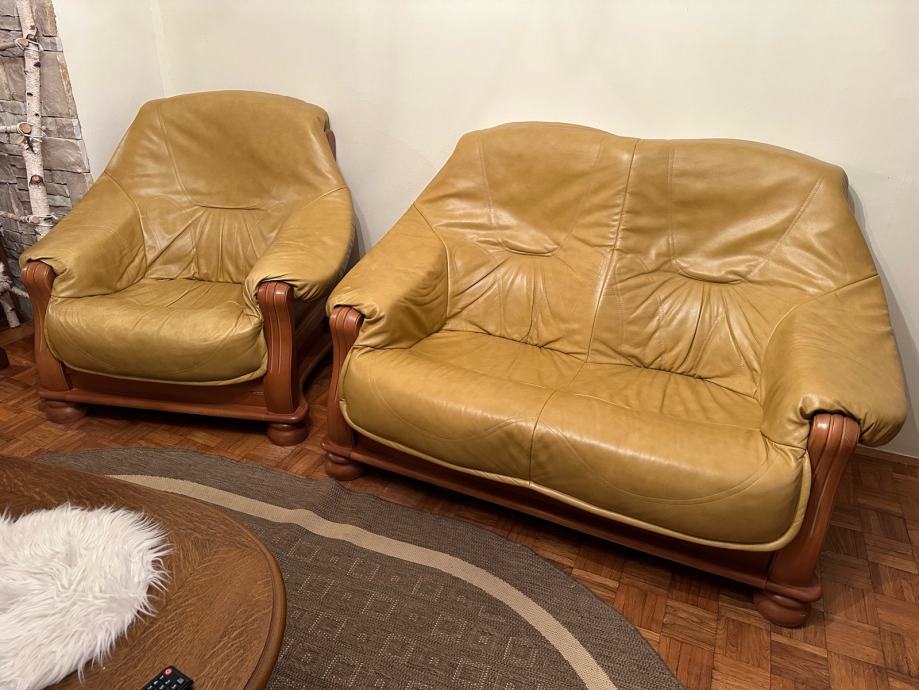 Prodajem trosjed, dvosjed i fotelju. Napravljen od hrasta i kože. Spinvalis firma. Trosjed ima malo oštećenje kao na slici.