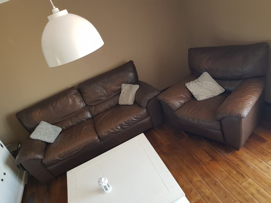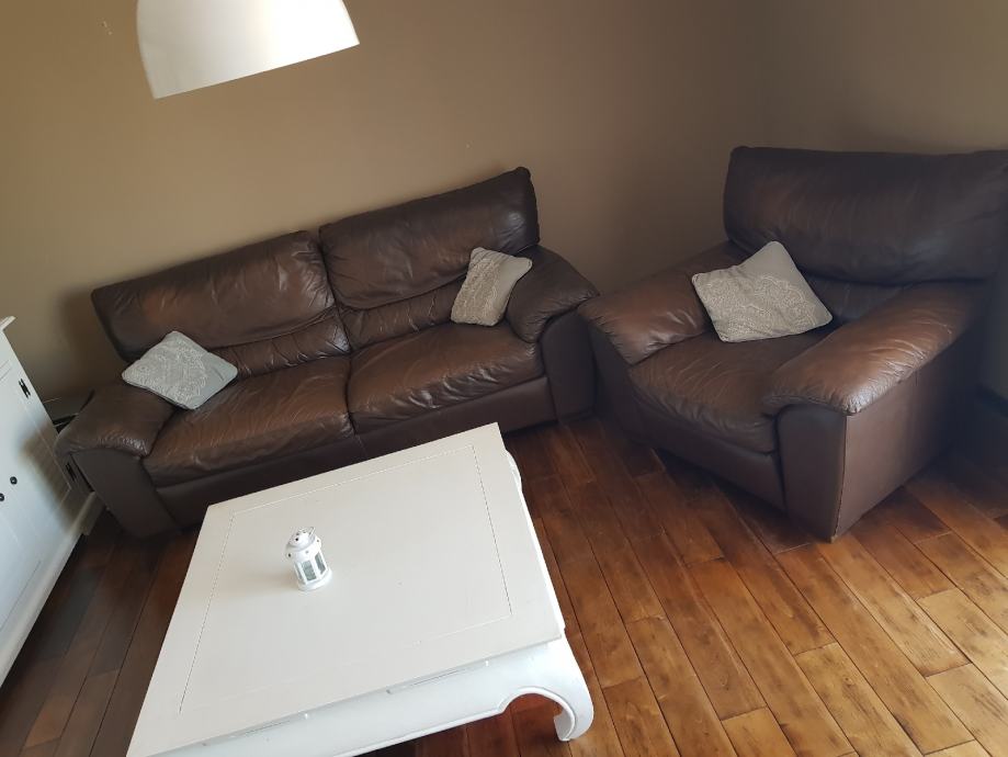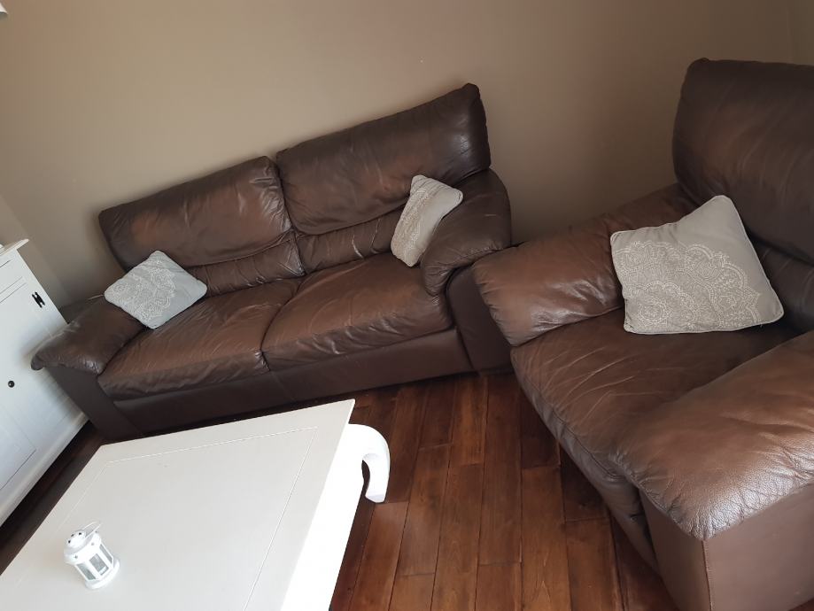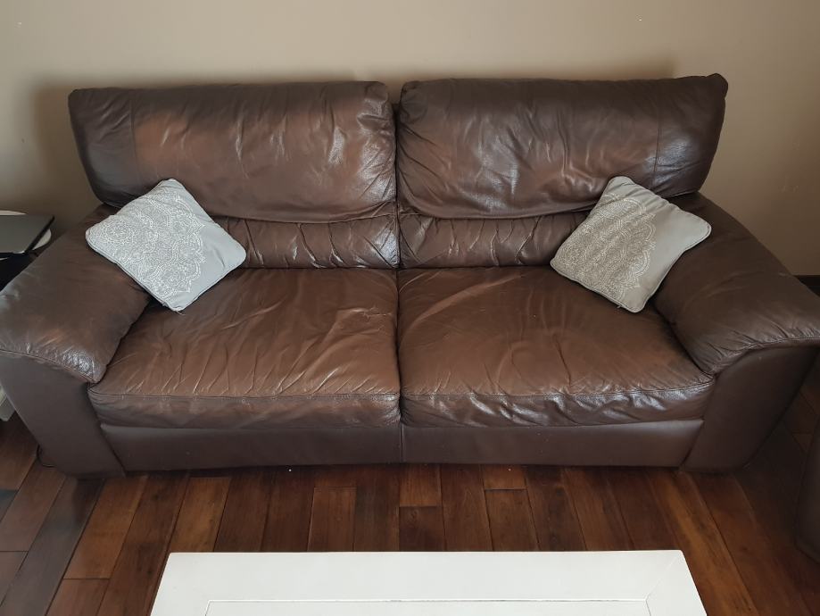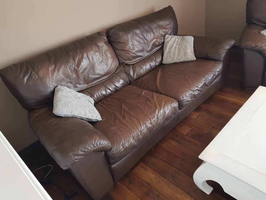 Trosjed i fotelja od prave kože, staro 5 godina, u dobrom stanju, jako udobno, na par mjesta oštećenja kože, plaćeno 13.000kn, ne razvlači se. Prodajem za 250 eura.