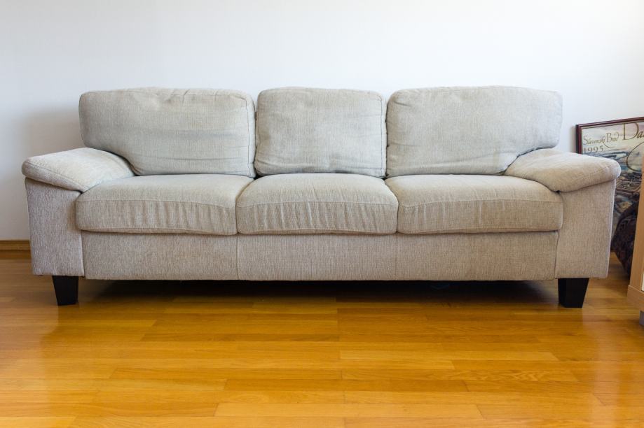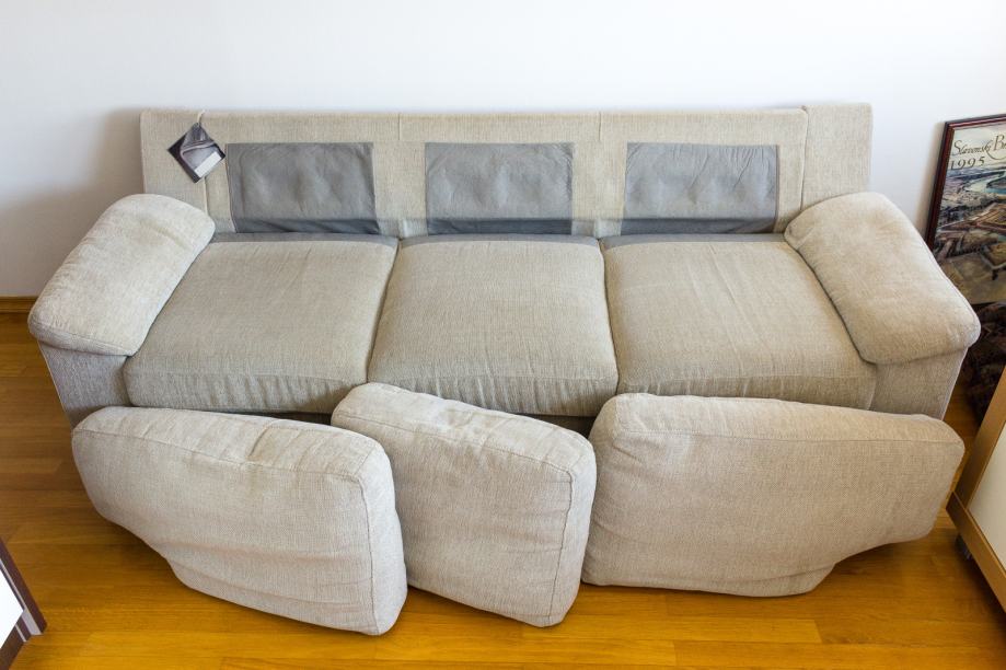 Krajnje udoban i bez oštećenja, trosjed kupljen prije tri godine u Jysku. Može ga se pronaći u trgovini u Slavonskom Brodu ili vidjeti na web stranici Jyska - zove se GEDSER: https://jysk.hr/dnevni-boravak/sofe/sofe/trosjed-gedser-boja-pijeska