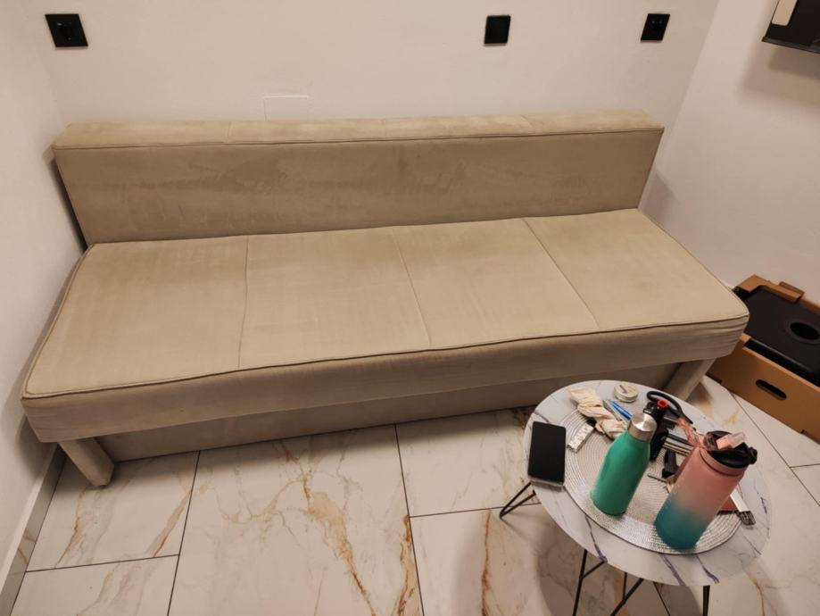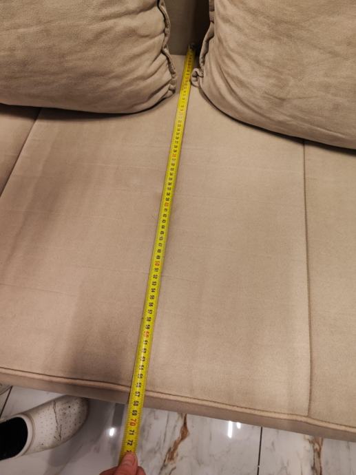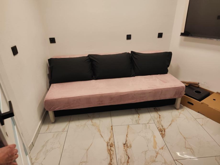 Prodajem trosjed na razvlačenje, Sklopljen dimenzija cc 190x85cm.sa 3 pripadajuca velika jastuka. Krevet je povremeno koristen u apartmanu, nije udubljen, dubinski ociscen, bez neugodnih mirisa... krevet se u dva poteza pretvara u lezaj dimenzija 125x195cm. Stanje ok. Nalazi se u Senju, prizemlje kuće, pristup vozilom 10 metara do ulaza.Cijena trosjeda sa 3 pripadajuca jastuka 150e. Uz krevet(kao na prvoj i zadnjoj fotografiji 192e.) moguće kupiti i 2 odgovarajuće plišane ljubicaste navlake za 20e+3 crne navlake za jastuke 12e+ crnu navlaku za podnožje kreveta za 10e.