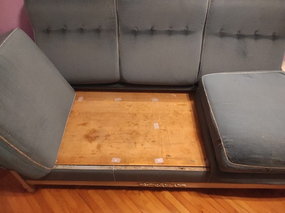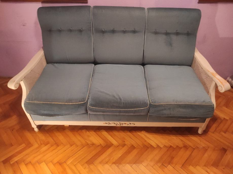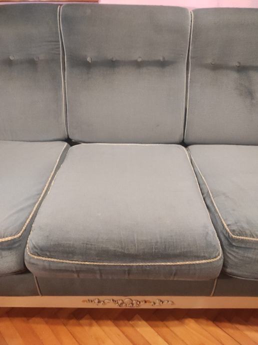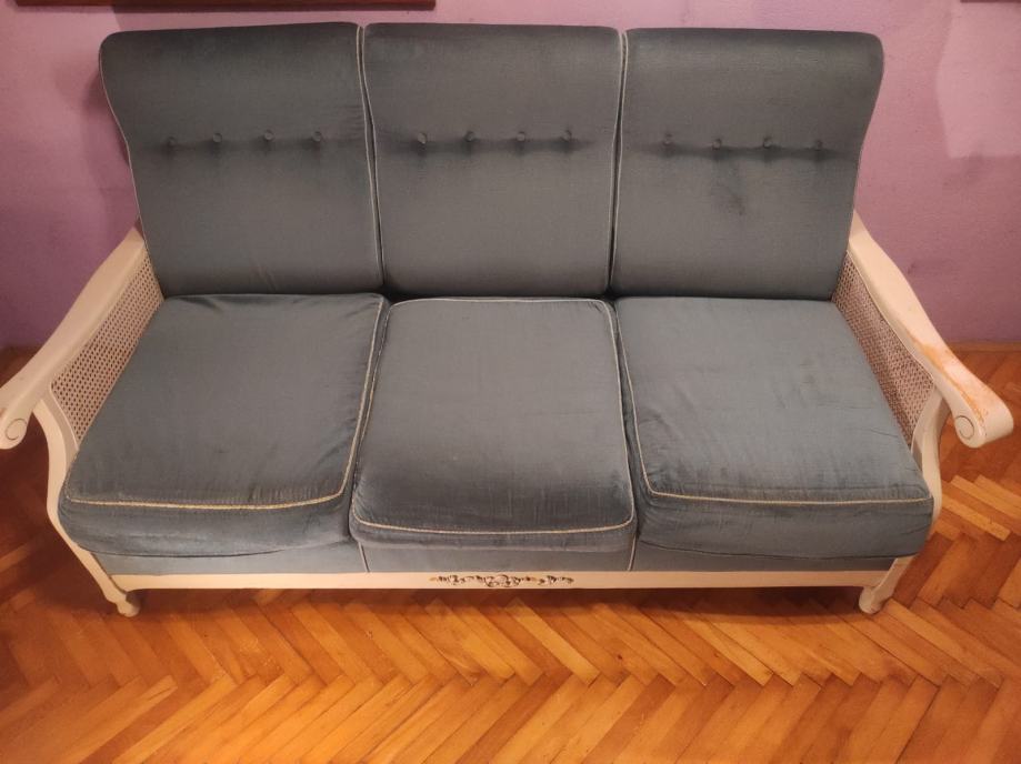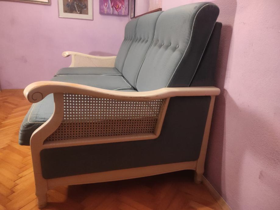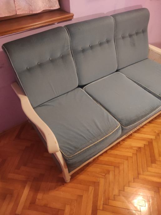 Opis: Drveni trosjed od punog drva, drvo očuvano i u vrlo dobrom stanju, drvena puna podnica, jastuci od spužve debljine 10 i 12 cm.