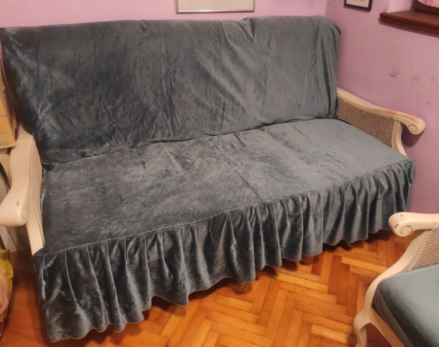 Proizvod: Drveni trosjed s tapeciranim jastucima i pokrivačem