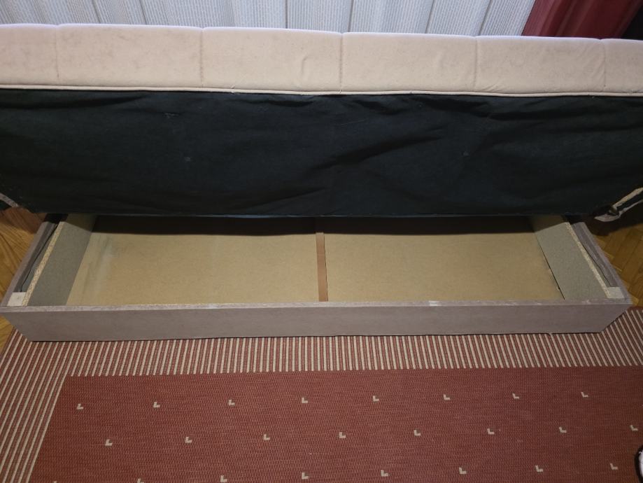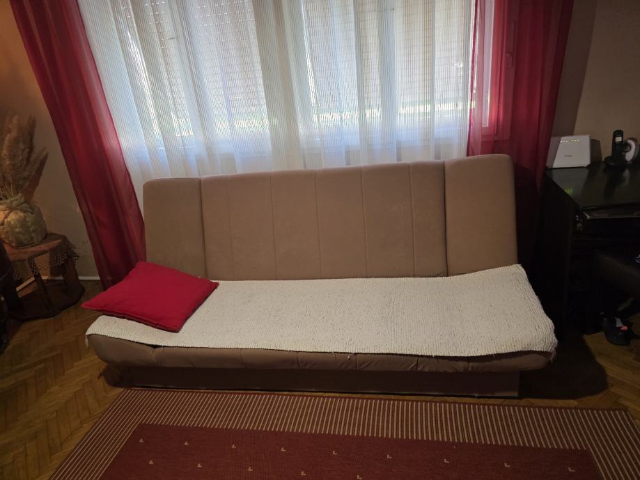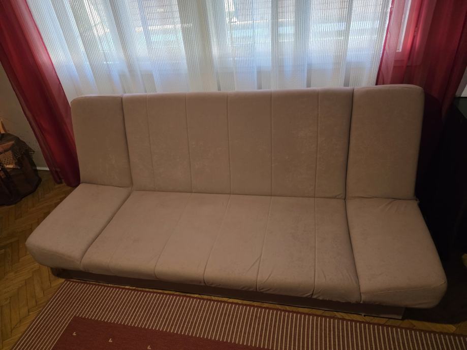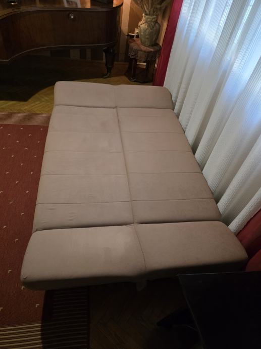Prodajem trosjed u bež/smeđoj tkanini koji se može razvući u ležaj. Trosjed ima praktičnu ladicu za odlaganje ispod sjedišta, što je posebno korisno za posteljinu ili ostale stvari. Tkanina je mekana i ugodna, a mehanizam za razvlačenje funkcionira bez problema.