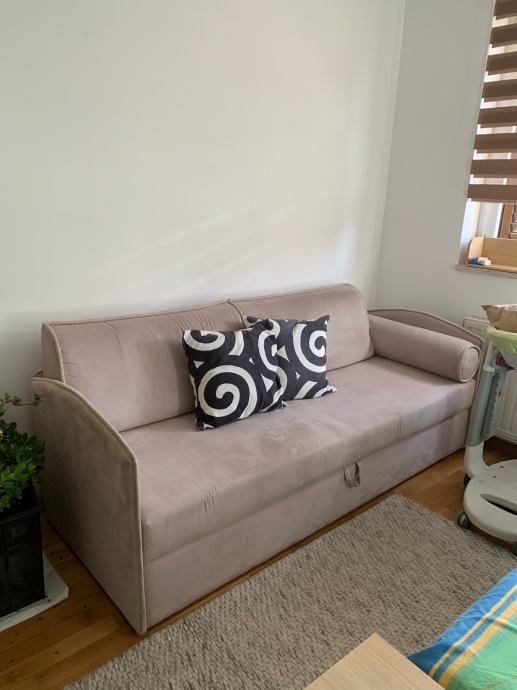 Prodajem rabljeni trosjed u svijetlorozoj boji, presvučen mekanom tkaninom nalik mikroveluru. Trosjed je kompaktnih dimenzija, prikladan za manje prostore, s čistim i jednostavnim dizajnom. Ispod sjedišta nalazi se prostor za odlaganje.