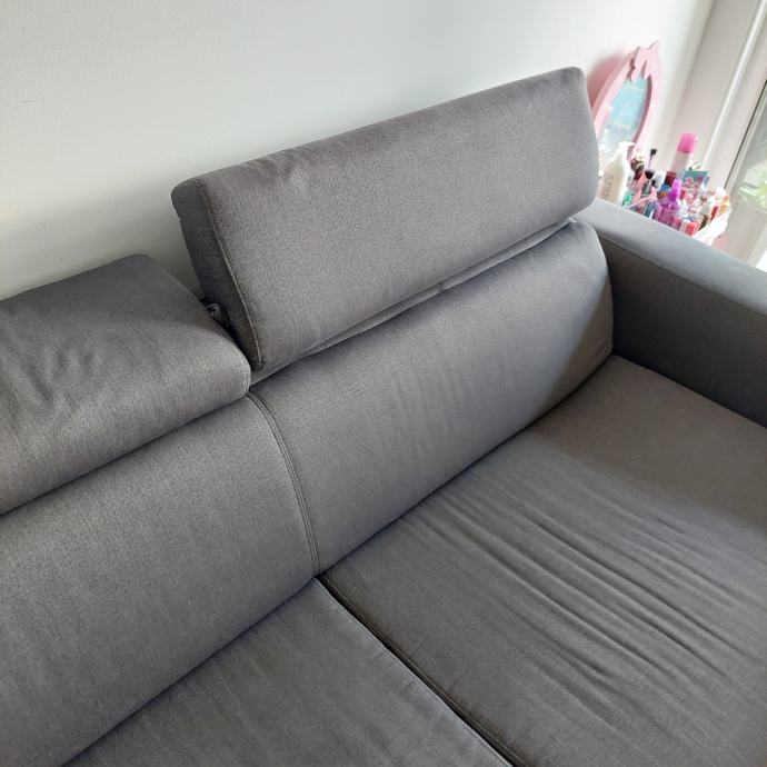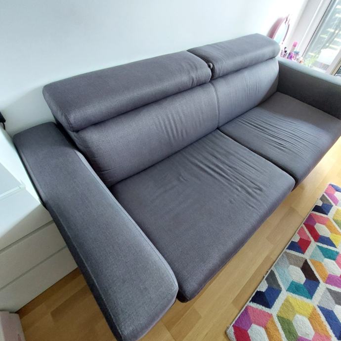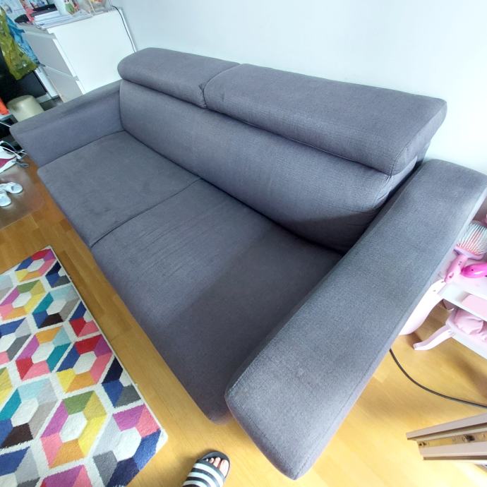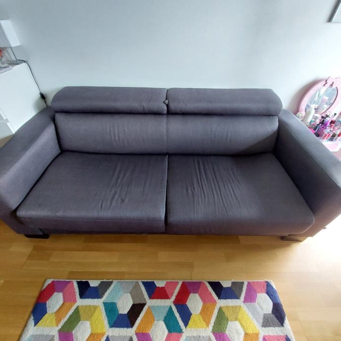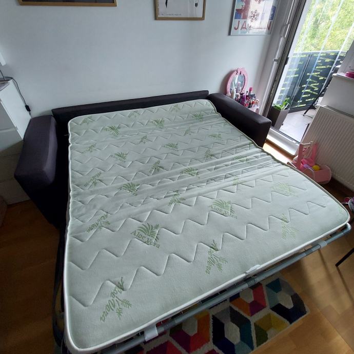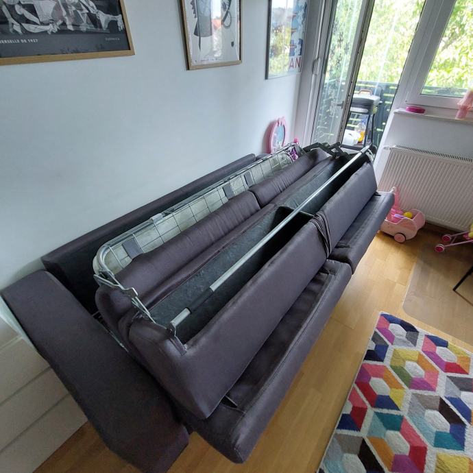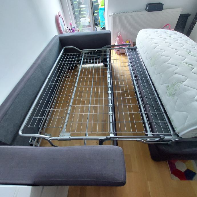 Trosjed na razvlačenje s madracem. Kupljen u lesnini 2020. Tekstil, tamno siva boja dimenzije: širina/visina/dubina: 222/83/104 cm. Površina za ležanje 160x190 cm.