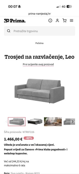 Trosjed na razvlačenje kupljen u Primi u super stanju al radi promjene stana hitna prodaja, materijal-koža