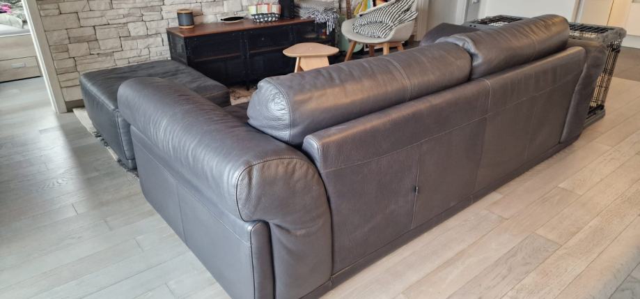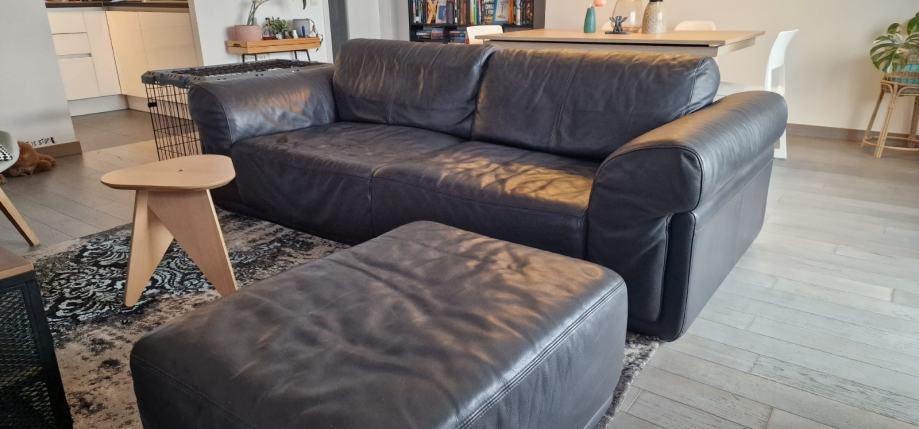 Izrazito udoban, elegantan i masivan kožni trosjed i tabure, idealan za dnevni boravak s profinjenim stilom.