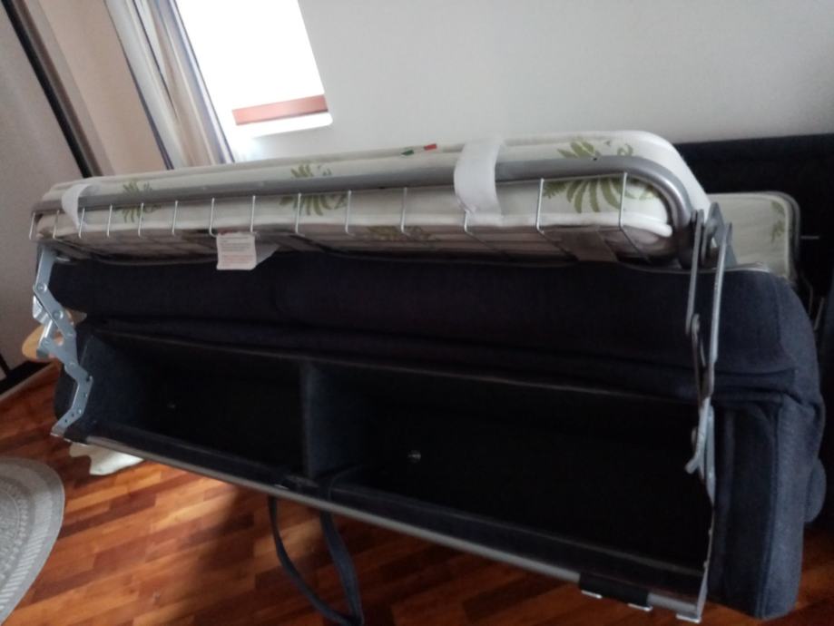 Prodajem trosjed Venda iz Lesnine, tamnoplave boje, u sebi ima integriran madrac, tkanina ima cifove pa se moze skinuti i oprati, uzglavlje je pomicno.