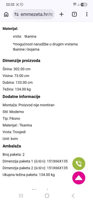 Prodajem trosjed star 3.5 godine, u dobrom stanju.Prekriven je od prvog dana.Nigdje nije ostecen.Širina: 302.00 cm Visina: 73.00 cm Dubina: 133.00 cm Težina: 134.00 kg