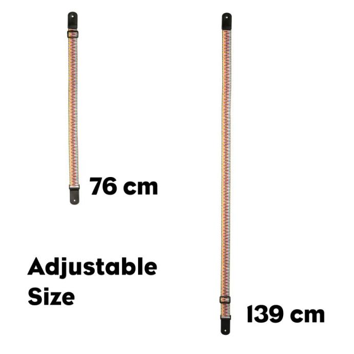 Cascha Ukulele remen Rainbow za ukulele. Kataloški broj remena: HH2200. Ovi kvalitetni Cascha remeni olakšavaju sviranje ukulelea i čine ga još ugodnijim. Cascha remeni naročito su praktični za live svirke jer između pjesama imate slobodne ruke ili ih u bilo kojem trenutku show programa, možete podignuti u vis. Cascha Ukulele remeni lagani su, a živopisne boje ih čine pravim lovcima na poglede. Krajevi Cascha Ukulele Rainbow remena napravljeni su od mekane crne kože što produžuje vijek trajanja remena. Remen je podesiv po dužini 76cm do 139cm i možete ga koristiti na raznim modelima ukulelea.