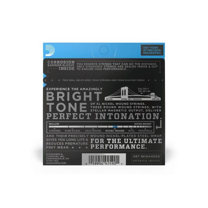D'Addario EXL110-7 je set za 7-žičanu električnu gitaru, EXL110 set + dodatna 7. žica 059 debljine, nudi idealnu kombinaciju tona, fleksibilnosti i dugog vijeka trajanja.