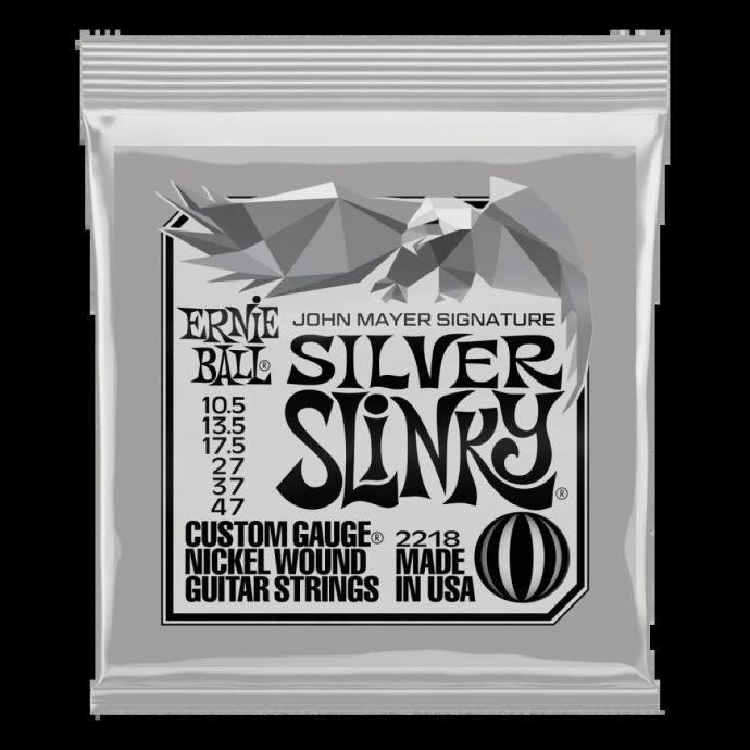 ERNIE BALL 2218 John Mayer Silver Slinky 10.5-47 su žice za električnu gitaru obložene niklom i omotane oko šesterokutne čelične jezgre od kositra.