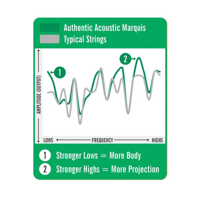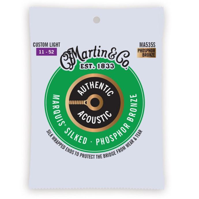 Martin® Authentic Acoustic® Marquis® Silked žice za akustičnu gitaru imaju mekani svileni omotač koji sprječava njihovo habanje. Ta dodatna debljina žica također osigurava da čepovi (pinovi) na mostu ostanu stabilni, čak i kod starijih mostova s istrošenim otvorima. Također, ovaj lagani svileni sloj doprinosi i ugodnijem osjećaju prilikom sviranja.