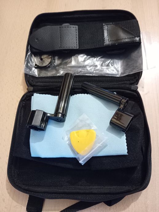 Remen za gitaru,krpa za poliranje gitare od mikrofibre,dvije motalice za žice,kutijica za trzalice koja se po potrebi moze zalijepiti na gitaru+torbica,nije korišteno samo stoji,pa da ne skuplja prašinu prodaje se za 5eur+poštarina