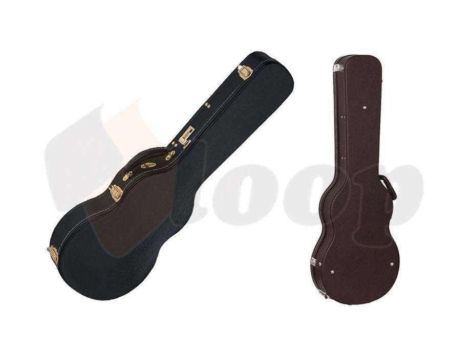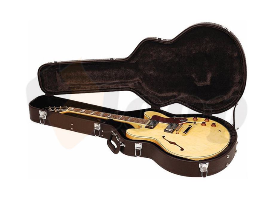 Čvrsti drveni kofer za hollowbody električne gitare (Gibson 335), presvučen sa smeđim tolexom, idealna protekcija s držačem i podstavom za vrat gitare. Poseban unutarnji odjeljak za čuvanje dodatne opreme (žice, remen, itd). Masivne kopče, metalne nogice i čvrsta ručka od PVC-a.
