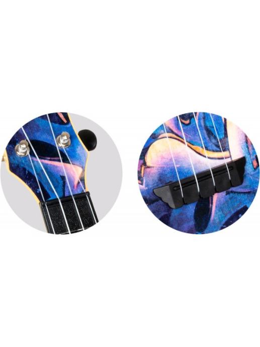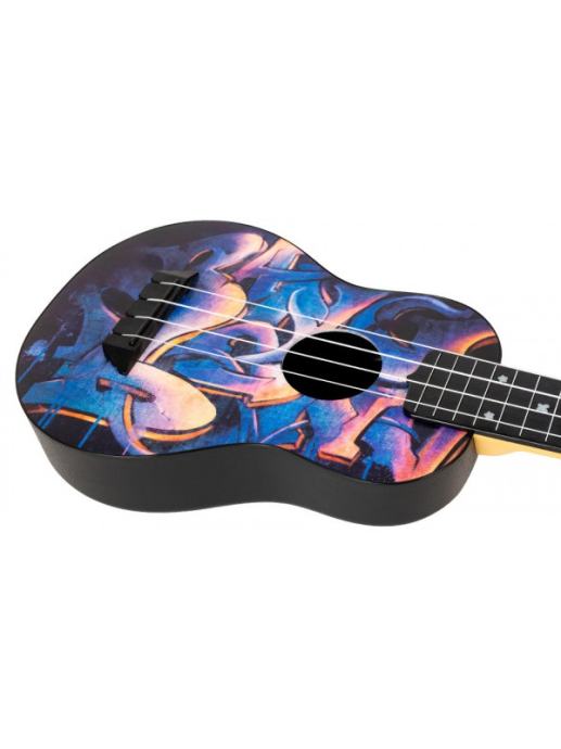 Plastični ukulele koji je dostojna zamjena svakom drvenom ukuleleu! Ovaj ukulele je namijenjen svima koji vole nositi ukulele sa sobom na putovanja , u prirodu, festivale i slično. Izrađen je od visokokvalitetne plastike koja će podnijeti kišu, pretrpane ormariće, dječju igru i sve uvjete u kojima ćete se naći. Grafiti dizajn nadahnut uličnom umjetnosti Londona. Unikatnog finisha za sve grafiti entuzijaste.