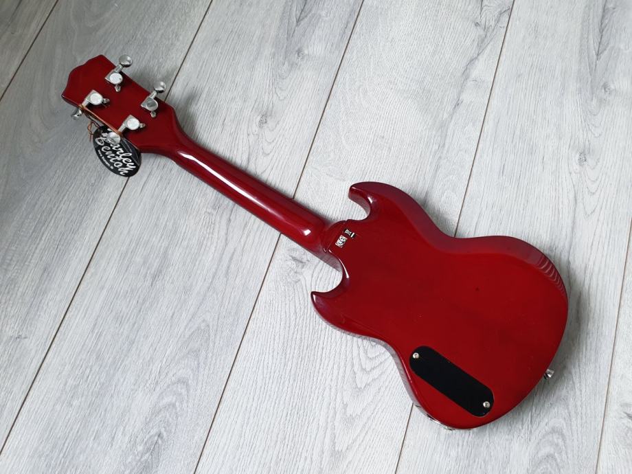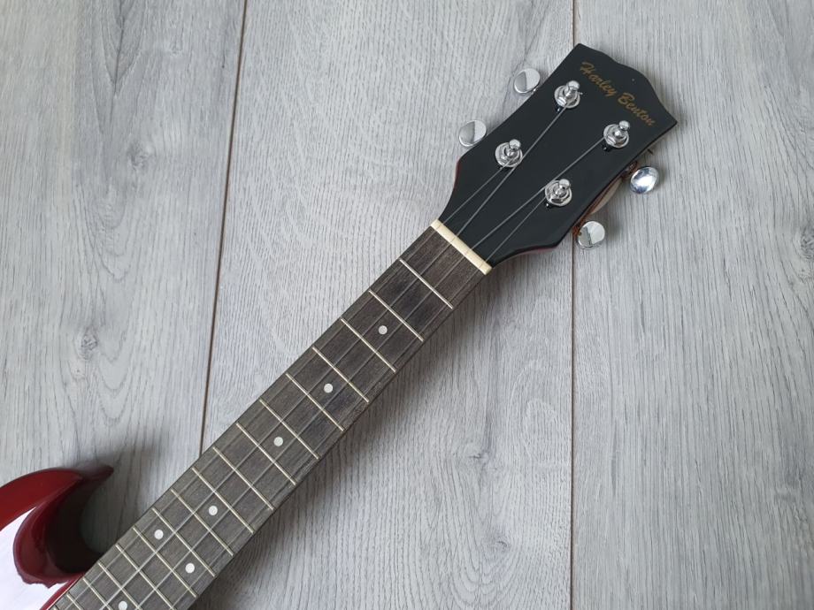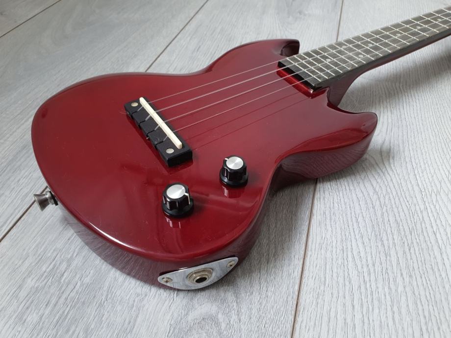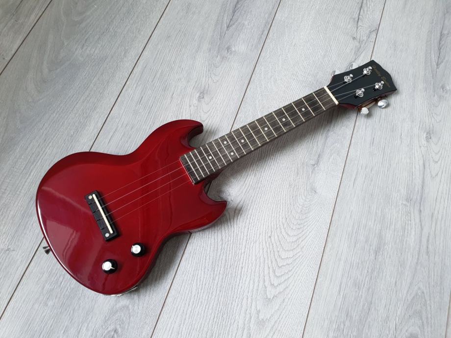 električni ukulele, s ugrađenim pickupom, zanimljivog SG oblika.