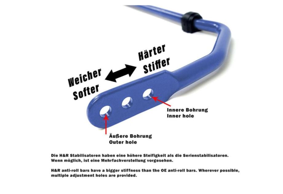 H&R stabilizatori: Razvijeni za smanjenje tendencija prevrtanja vozila i istovremeno nude bolje rukovanje. H&R stabilizatori poznati su iz moto sporta. Umjesto standardnih stabilizatora ugrađen je H&R stabilizator. H&R sada ovu tehnologiju prenosi izravno na cestu, čineći je dostupnom svim vozačima. Izrađeni od čelika visoke čvrstoće i s precizno kovanim krajevima, H&R stabilizatori su djelomično višestruko podesivi. Povezani ležajevi sastoje se od posebno razvijenog kompozitnog materijala koji sprječava buku, jamči trajno minimalno trenje i ne zahtijeva podmazivanje tokom cijelog životnog vijeka. H&R stabilizatori instalirani su umjesto standardnih stabilizatora i mogu se kombinirati sa standardnim, kao i sportskim ovjesima i gewindama, bez obzira na proizvođača. Oni također nude alternativu za sve koji ne žele spustiti svoje vozilo, ali ipak žele bolju, sportskiju postavu svog vozila.