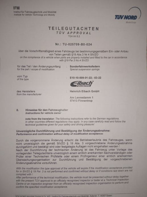 Eibach opruge za Alfa Romeo Giulietta s TUV certifikatom. Uz opruge idu i originalni tvornički ispravni amortizeri.