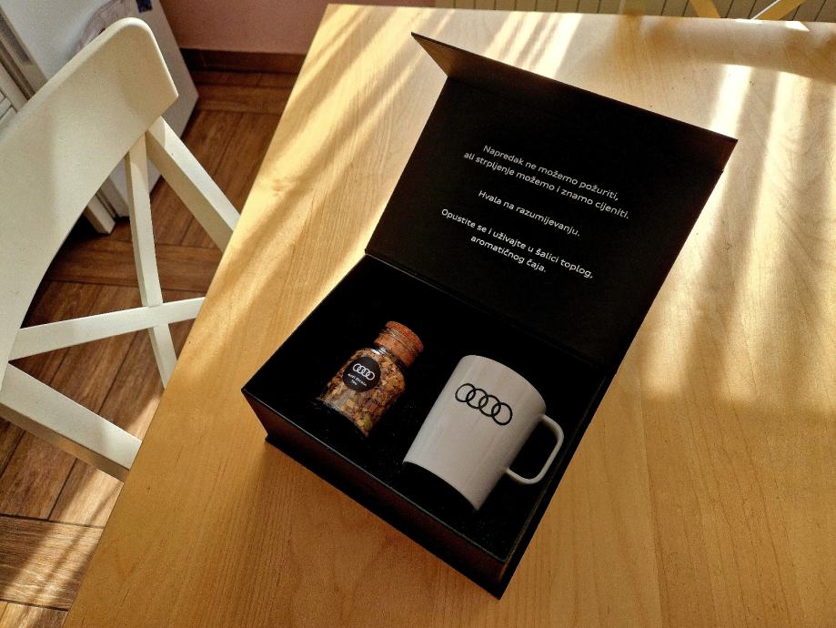 Prodajem originalni Audi poklon paket. Paket sadrži originalnu Audi šalicu, te pakiranje čaja, sve skupa zapakirano u luksuznu Audi kutiju s porukom.