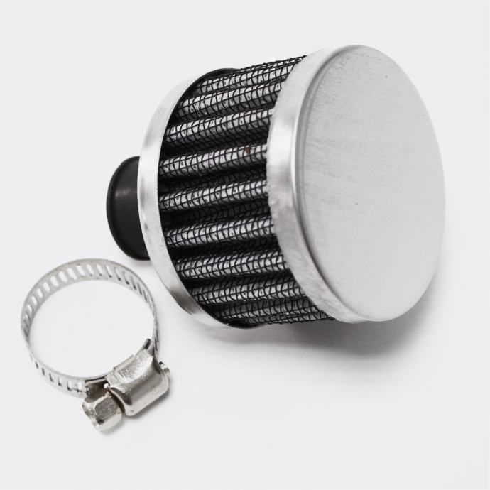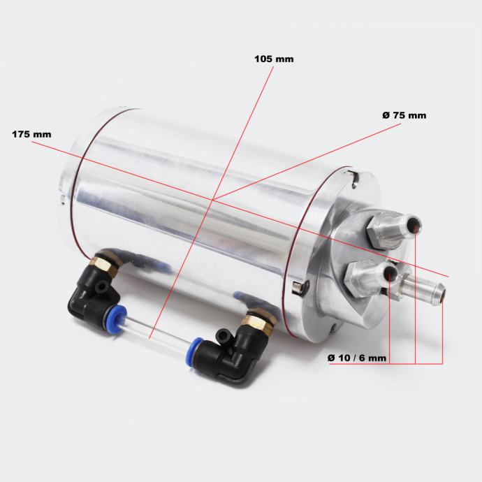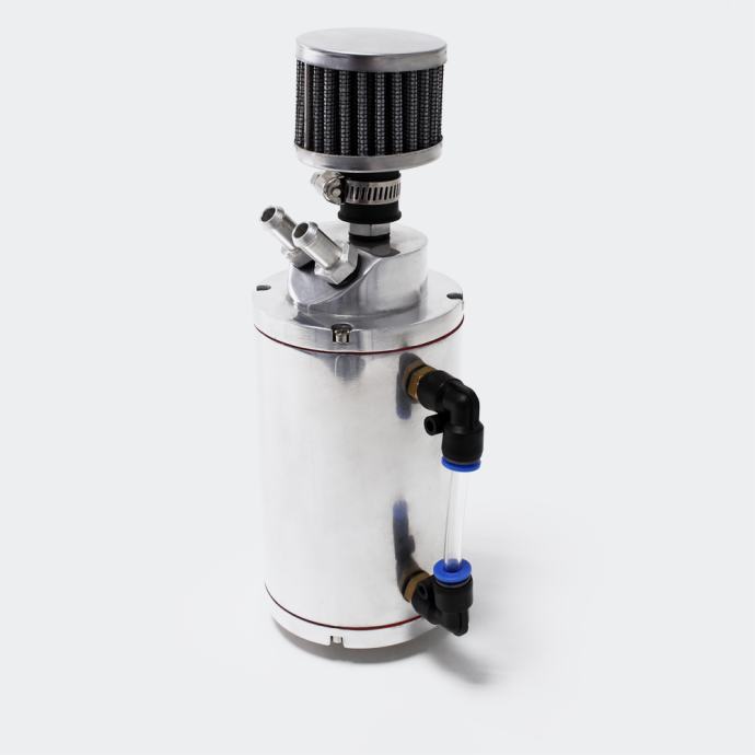 Posuda za uljne pare od visoko poliranog 6063 aluminija. U kompletu sa filterom uljnih para, prihvatima, nosačima i crijevima. Univerzalna za sve tipove automobila. Veličina L (175x105x75 mm), 0.3 l.