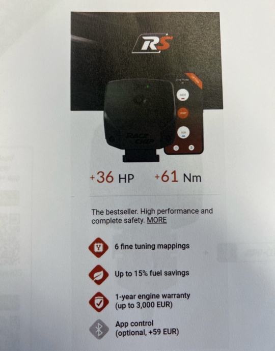 Race Chip RS za 1.5 TSI motor 110 kW za vozila VW koncerna. Dodatnih 36 KS i 61 Nm. Povezivanje i aktivacija preko aplikacije putem mobitela i bluetootha. 6 mapa. Novo, zapakirano, nikad ugradjivano. Nije povezan s glavnim računalom vozila pa ne utječe na garanciju vozila. Upute za ugradnju uključene. Kontakt: 098/1922-337
