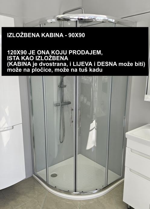 KABINA MOŽE NA PLOČICE DIREKTNO ILI NA TUŠ KADU (tuš kada ima za 270 eura kupiti). Kabina je polukružna da manje zauzima u kupaoni, a opet i više nego prostrana.