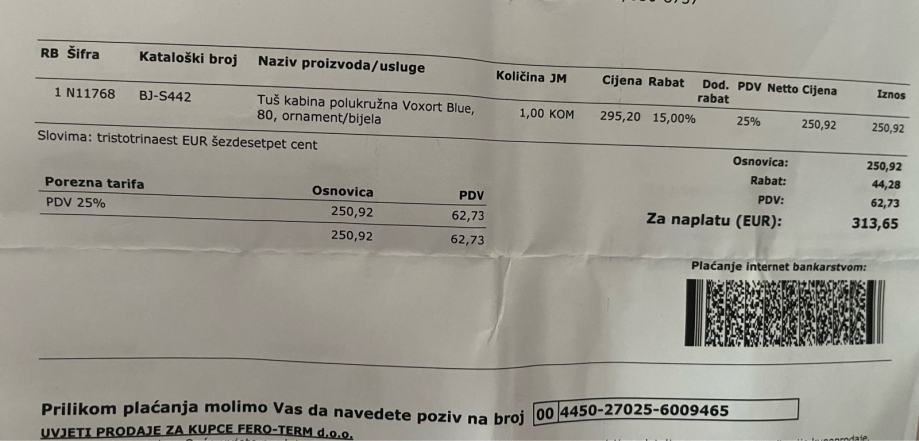 Prodajem novu tuš kabinu kupljena greškom 80cm (potrebna 90cm). U Ferotermu ne žele zamjenu jer su plasticne vezice s ambalaže skinute. Plaćena 313€, 11.10.2025.