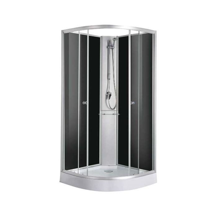 Tuš kabina s ABS kadom visine 18 cm. 4 mm transparentno staklo vrata te 4 mm crna stražnja stakla tuš kabine. Tuš set s policom. Sifon je uključen.