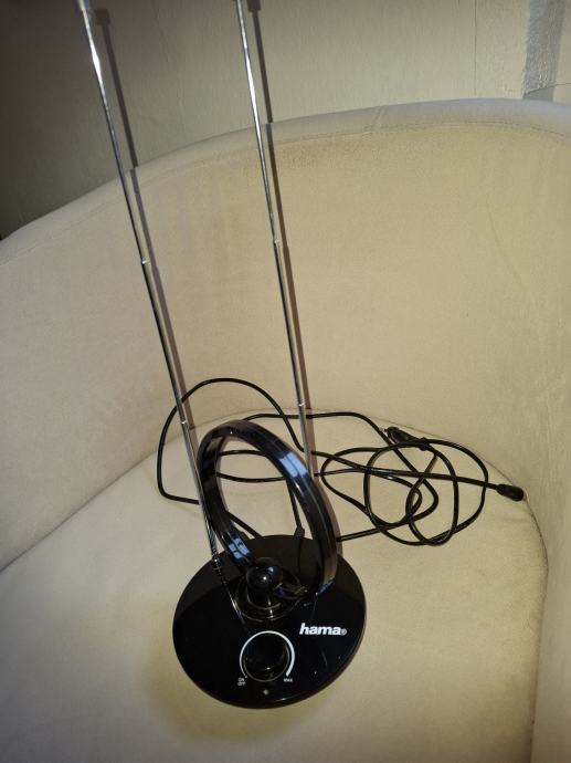 Prodajem novu sobnu antenu Hama, model DVB-T indoor aerial, crne boje. Antena dolazi s teleskopskim dipol elementima i okruglom bazom s regulatorom pojačanja (ON/OFF/MAX). Napajanje je putem struje (230V, 50Hz, 15mA), a kabel za priključak je uključen.