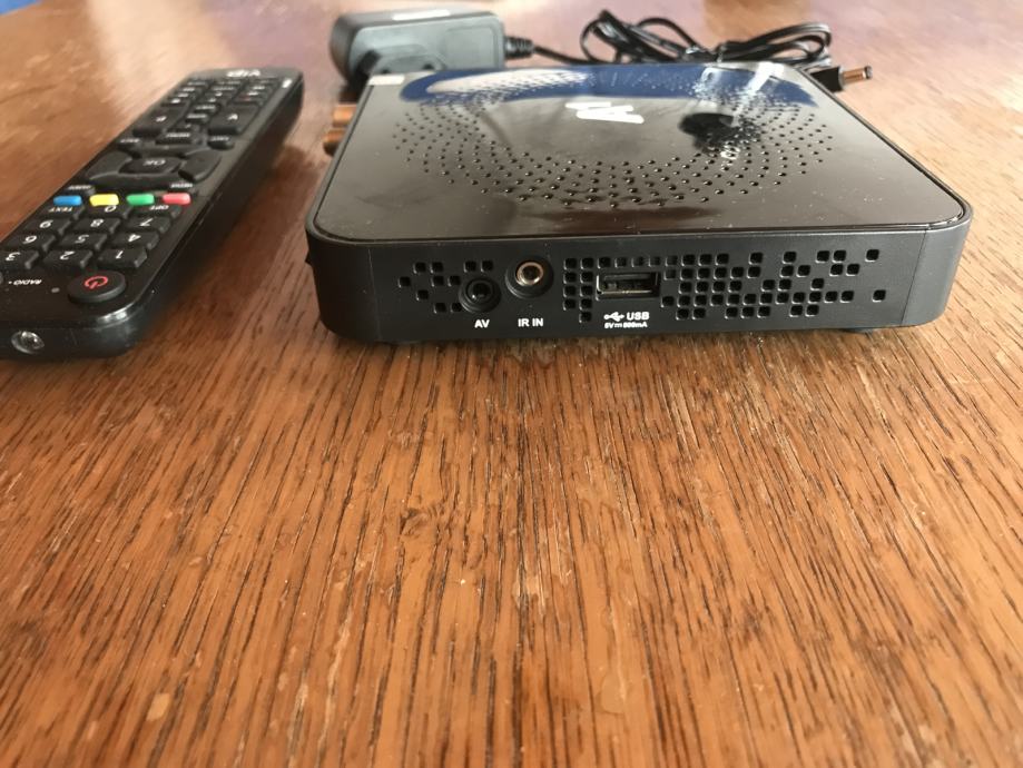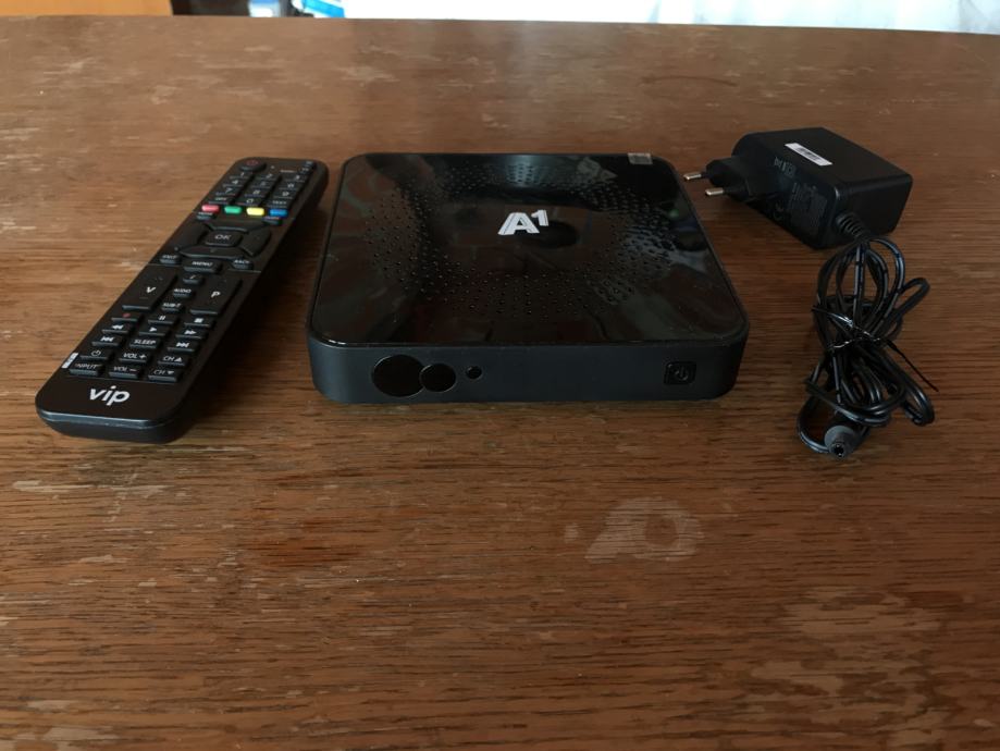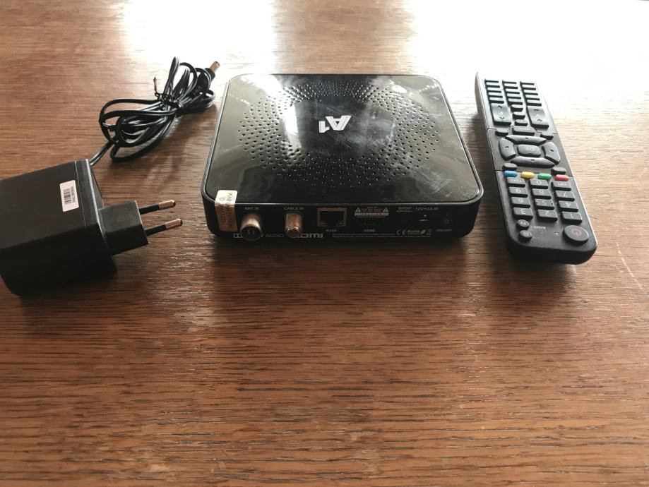 A1 prijemnik sa daljinskim i adapterom za napajanje. Od priključaka ima hdmi izlaz, lan, IR in, AV, priključak za antenski te satelitski kabel.