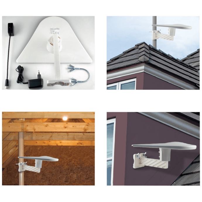 Vanjska antena sa pojačalom, frekventni opseg 87.5 - 230 MHz / 470 - 862 MHz, UHF/VHF, max. pojačanje do 56 dB, impedanca 75 Ω, dimenzije 320 x 30 x 230 mm. Napajanje 230 V ~ / 50 Hz, optimizirana za DVB-T / T2 prijam, montaža na zid ili nosač ( cijev )