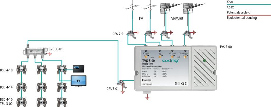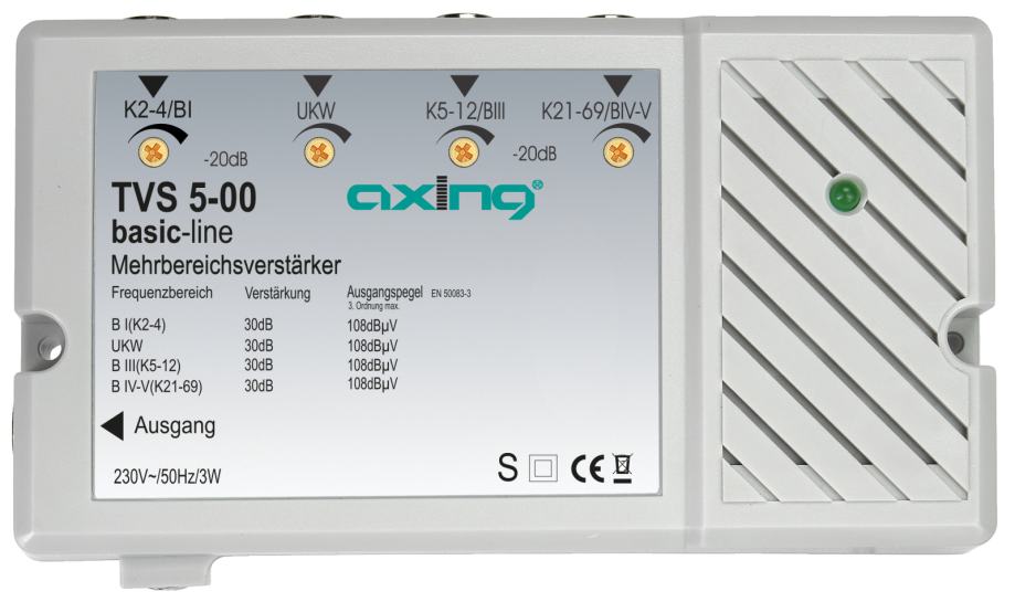 For amplification of terrestrial, analogous or digital DVB T television and adjustment of radio programmes simply between the DVB-T antenna and the connected receiver in order to compensate for the line losses and system losses (distributor, splitter, antenna switches)