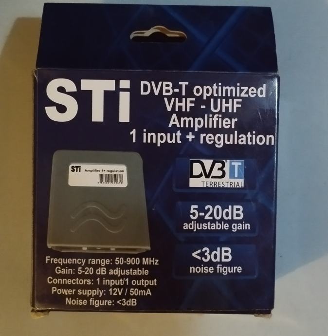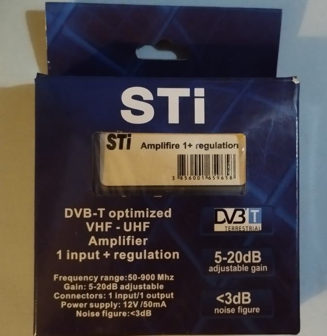 Antensko pojačalo sa regulacijom STi amplifire 1+ regulation, s podešavanjem 5-20db, s napajanjem preko antenskog kabla, dva kraća antenska kabla sa 4 konektora F.