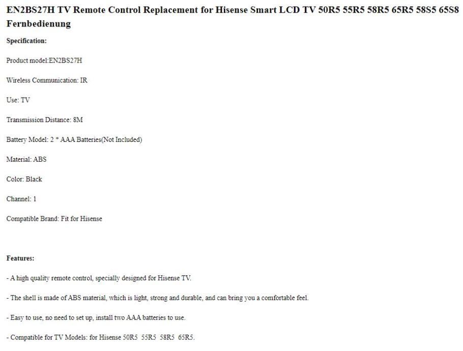 Daljinski Hisense EN2BS27H RC Remote Control Smart LCD TV 50R5 55R5 58R5 65R5 58S5 65S8 Replacement