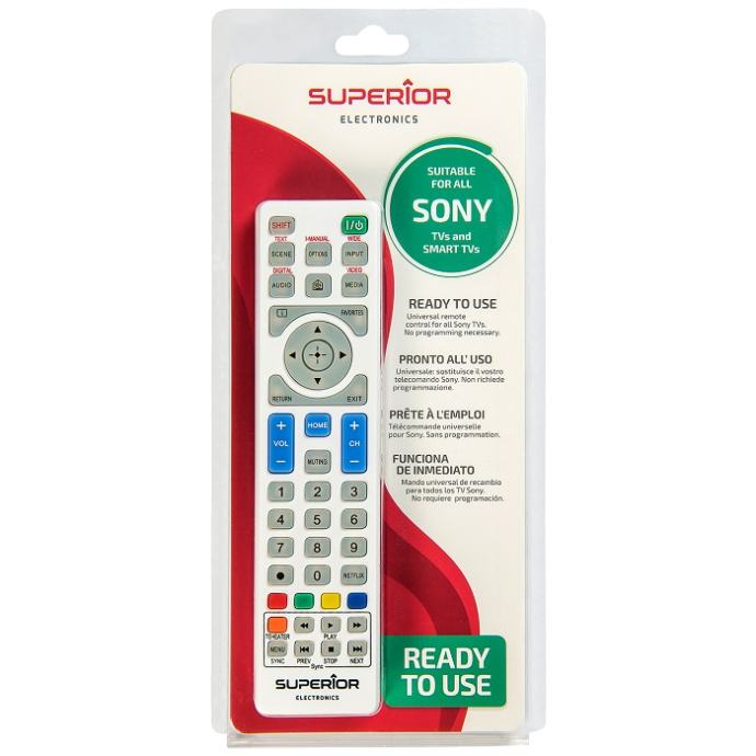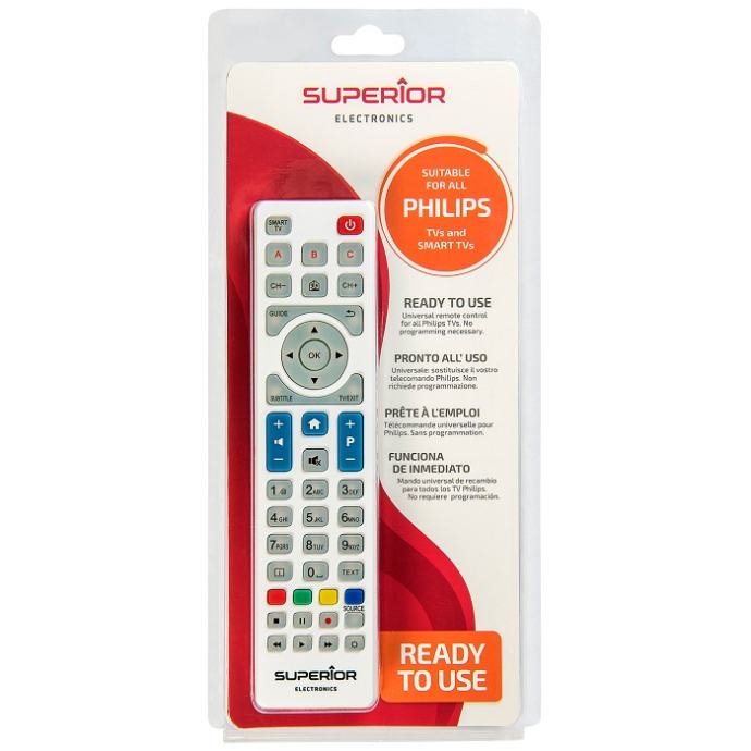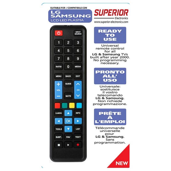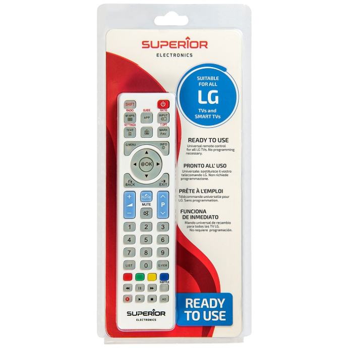 Univerzalni daljinski upravljač sa več predefiniranim kodovima za sve TV prijemnike LG i SAMSUNG, PANASONIC, PHILIPS, SONY proizvedene od 2000-te godine, dvostruki IR prijenos čini ovaj daljinski upravljač odmah funkcionalnim. Napajanje baterija AA x 2