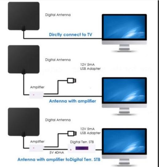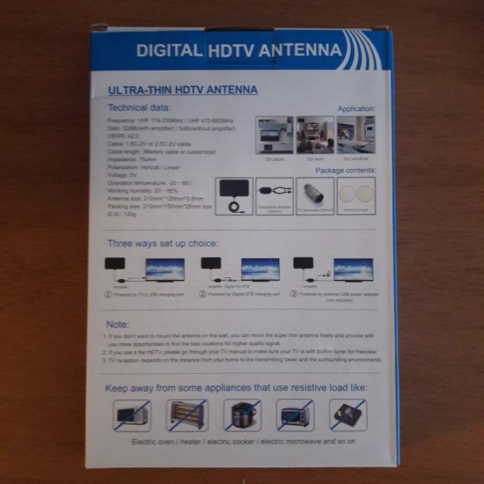 TV antenu možete spojiti direkt na priključak Antena IN na stražnjoj strani televizora ili resivera ili preko adaptera USB ako mislite stavit antenu na udaljeniju poziciju od televizora. Sve je u paketu. Unutarnja antena ne zahtijeva drugi izvor napajanja. Jednom kada se povežete, lako možete pronaći kanale i programe u TV izborniku. Svaki put kada skenirate signal, možete testirati različite lokacije po kući.