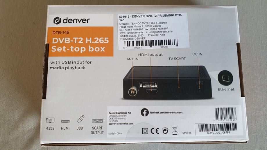 Denver DTB-145 digitalni prijemnik koristi se za DVB-T2 zemaljski signal. Podržava EPG - elektronički programski vodič, DVB titlove i podršku za teletekst, visoke definicije (HD) signale 720p/1080p putem HDMI ulaza i izlaza, napredni audio procesor koji podržava Dolby Digital i Dolby Digital Plus reprodukciju medija putem USB ulaza i LED zaslon.