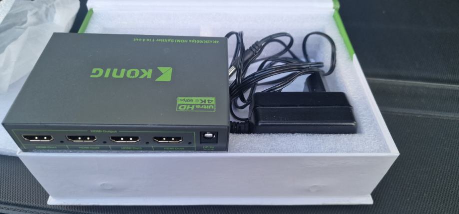 Prodajem kvalitetan Konig HDMI splitter, 1in-4out. Prakticki nekoristeno, stanje kao novo. Lokacija Zagreb / Folnegovicevo. Kontakt isključivo na bradazg@gmail.com. Nikakve zamjene me ne zanimaju. Dolazi u originalnoj kutiji sa originalnim strujnim adapterom.