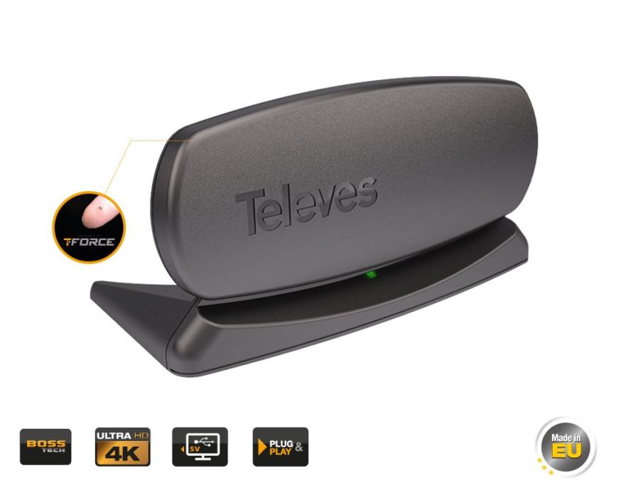 Kućna inteligentna antena s Plug & Play instalacijom. Svesmjerna i inteligentna antena, posebno dizajnirana za prijem DTT signala u zatvorenom prostoru. Inteligentni način rada može se aktivirati pomoću uobičajenog PSU-a za pametne telefone ili USB priključkom televizora, što olakšava postupak instalacije (Plug & Play).Sustav BOSSTech automatski kontrolira razinu primljenog signala (bilo vrlo visoka ili vrlo niska) radi postizanja optimalne izlazne razine. Novi dizajn korištenjem TForce tehnologije čini ovaj inteligentni uređaj još svestranijim.