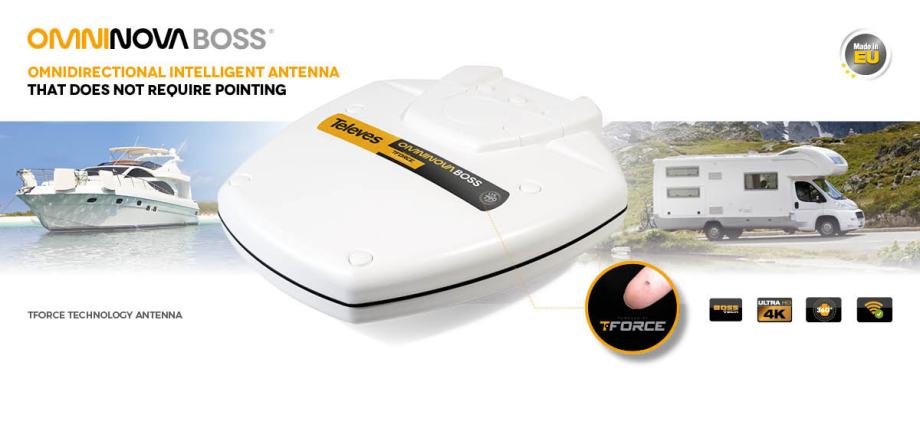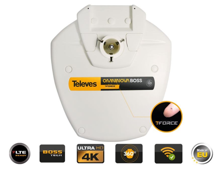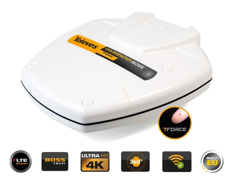 Antena s mogućnošću primanja od 360 ° (svesmjerna), stoga više ne treba antenu usmjeravati prilikom promjene lokacije. Savršen je za prijem DTT-a u pokretnim objektima (brodovi, kamperi ...) za kraći boravak.Sustav BOSSTech automatski kontrolira razinu primljenog signala (bilo vrlo visoka ili vrlo niska) radi postizanja optimalne izlazne razine. Novi dizajn korištenjem TForce tehnologije čini ovaj inteligentni uređaj još svestranijim.Na raspolaganju je kompletni instalacijski komplet koji se sastoji od:12V PicoKom jedinica napajanja (Ref. 579401) Strujni inektor za priključenje akumulatora (Ref. 7450) Ravan nosač za ugradnju anteneF priključak. Vijci s montažnim ključem za ugradnju na jarbol.