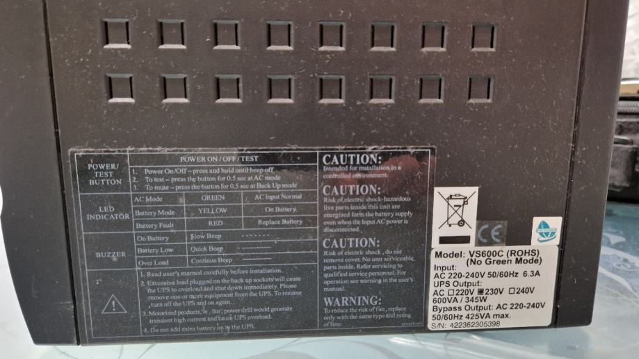 Opti-UPS VS-600C • Value Series Back-UPS • Standby Power 600VA/345W • 3 UPS outlets + 3 surge protected outlets, Integrated protection for telephone / modem / LAN card • RS232 communication port • Upravljački softver za UPS •