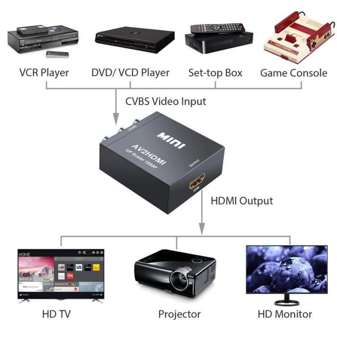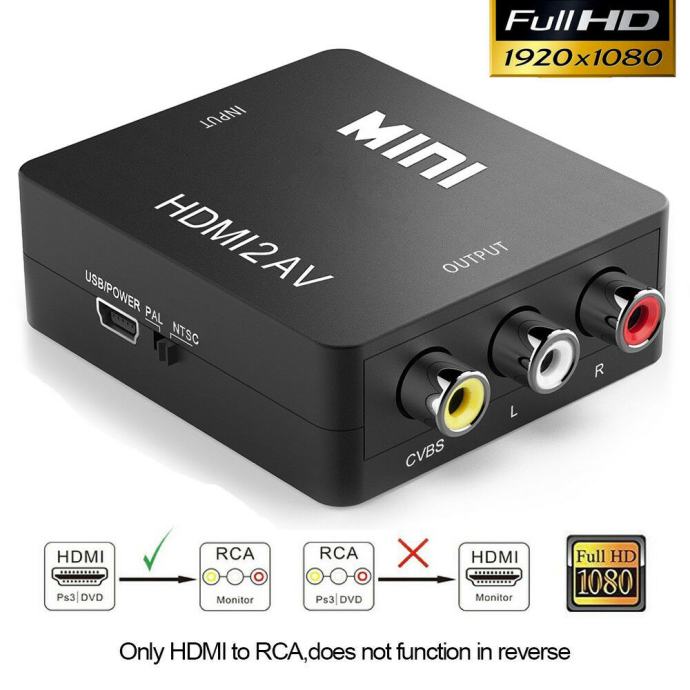 11. Mini AV2HDMI, adapter (konvertor) 3xRCA to HDMI (1080p). Konvertor pretvara analogni audio i video signal (kompozitni) u digitalni HDMI signal. To omogućava priključenje uređaja s kompozitnima kao npr. PC ili starijih DVD reproduktora na npr. TV ili HDMI. Rezolucija se može mijenjati između 720p ili Full HD - cijena 100kn - PRODANO