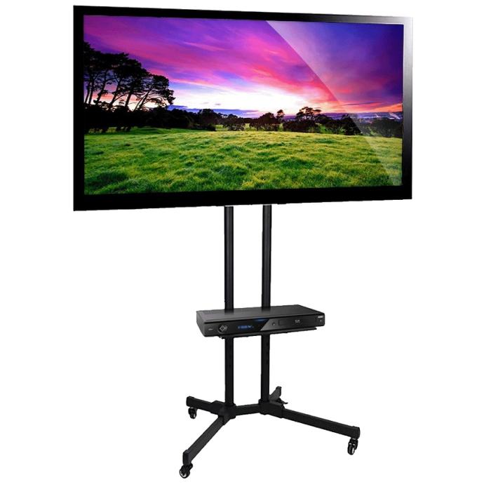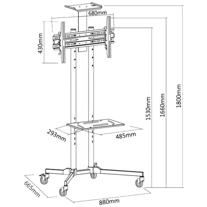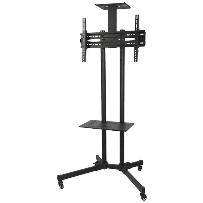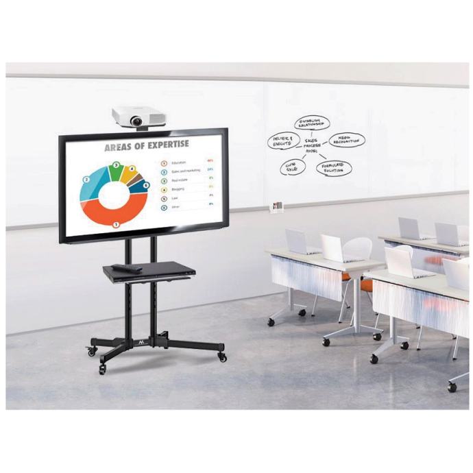 Savršen stol za konferencijske sobe, zračne luke, javne izložbe ili druge profesionalne prezentacije.Univerzalni stalak s nosačem za montažu LED, LCD, plazma TV-a i monitora težine do 50 kg. Na nosač integriran u stolu možemo objesiti TV od 32 - 55 inča s maksimalnim razmakom vijaka od 400 mm x 600 mm.Ručka je plastificirana, zahvaljujući ovoj metodi otporna je na koroziju i ogrebotine.Ugrađena, podesiva donja polica omogućuje vam instalaciju dodatne opreme kao što su DVD, prijemnik, tablet, prijenosno računalo, konzola itd.Gornja polica omogućuje postavljanje projektora ili zvučnika! Stalak karakterizira praktičan dizajn, vrlo jednostavna montaža i vrlo širok izbor televizora koji se na njega mogu montirati. Stol je izrađen od visokokvalitetnih materijala. Kolica su opremljena s četiri kotača (s bravom) zahvaljujući kojima možete jednostavno premjestiti cijeli set na bilo koje mjesto. Set sadrži vijke potrebne za pravilnu montažu i slikovne upute za montažu.Četiri kotača za amortizaciju (gumirani) omogućuju vam da lako izdržite težinu opreme, a istovremeno omogućuju učinkovito manevriranje i jednostavno postavljanje stola. Stalak također ima integrirani sustav maskiranja kabela. Savršen stol za konferencijske sobe, zračne luke, javne izložbe ili druge profesionalne prezentacije.Navedena veličina zaslona samo je prijedlog. Veći TV ili monitor može se montirati na nosač postolja ako ne prelazi maksimalnu težinu i zadovoljava navedeni VESA standard.Na držač možemo lako pričvrstiti VESA standardni ekran: 200x200, 200x300, 300x300, 200x400, 300x400, 400x400, 400x600.